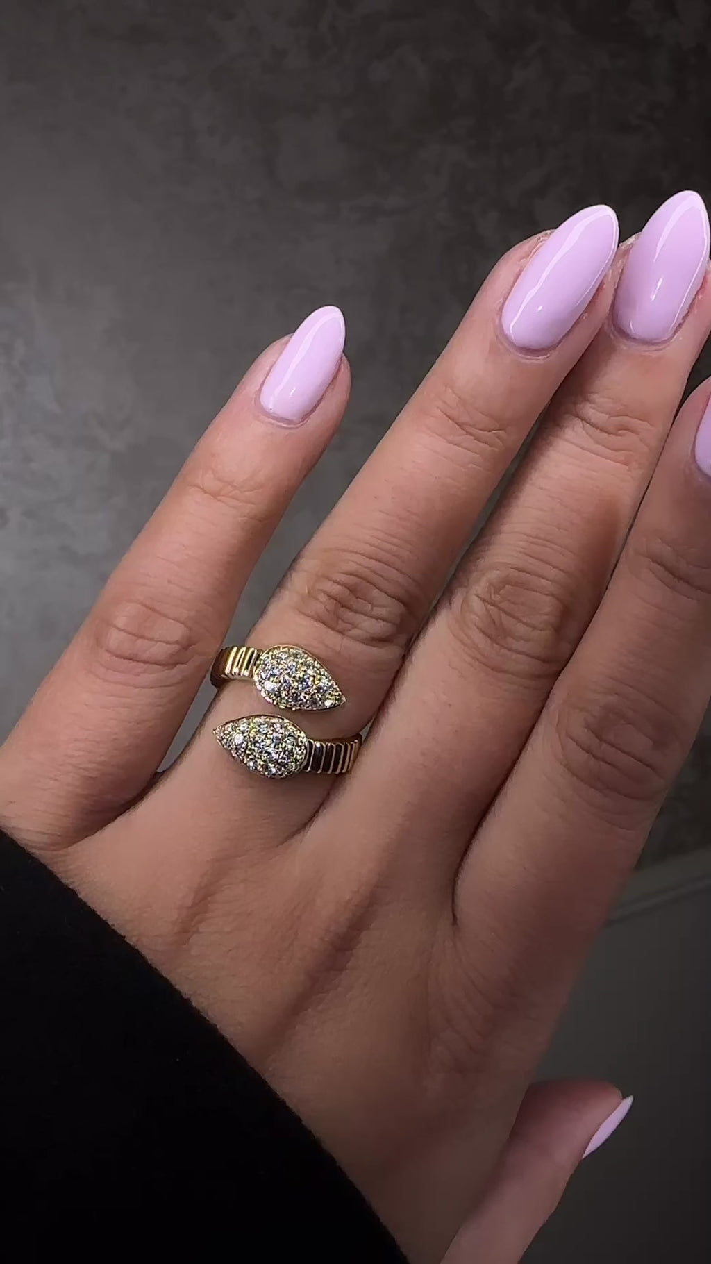 Set with natural mined diamonds totalling 0.70 carats, arranged in pear shaped pavé heads that mirror each other beautifully at the open front of the ring.
