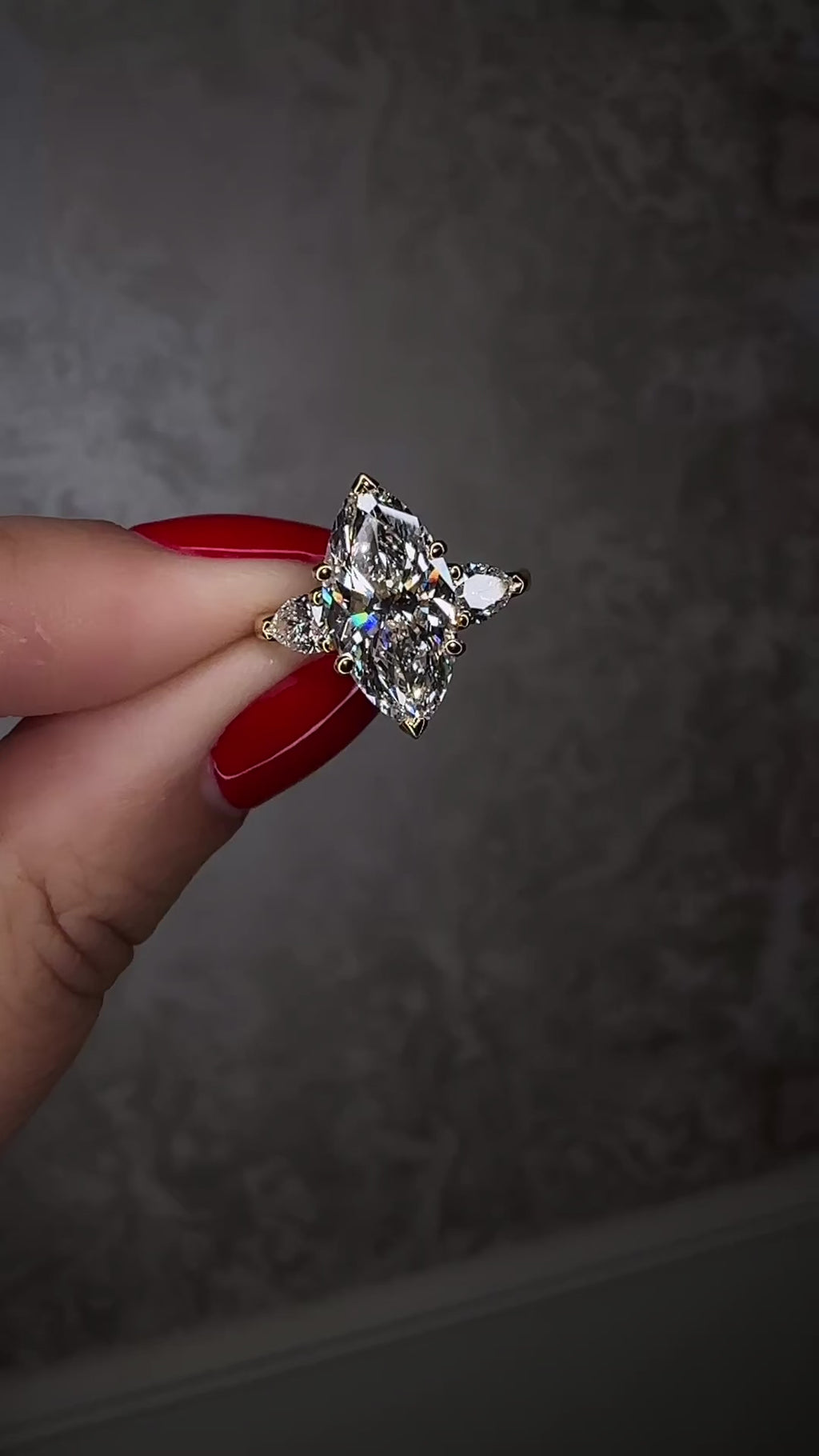 3ct marquise cut lab grown diamond engagement ring with two pear cut side diamonds totalling 0.60ct, set in 18kt yellow gold, handcrafted by Layla Diamonds London