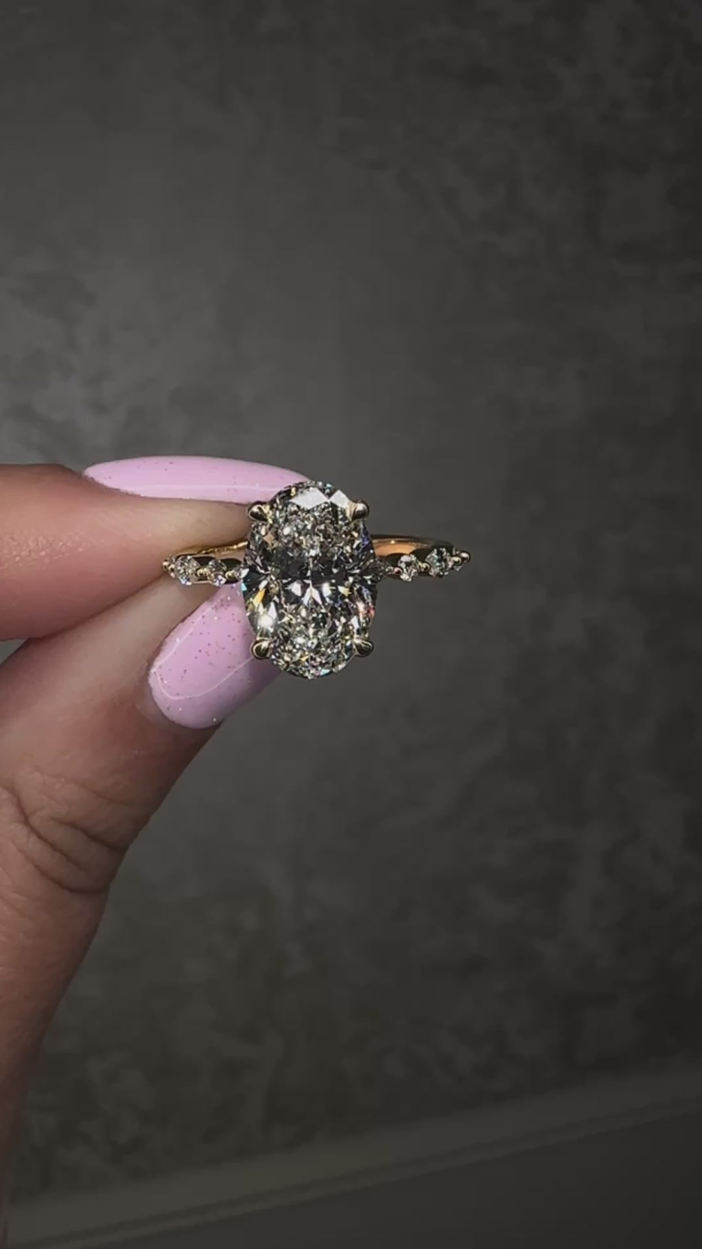 A 3ct lab grown oval cut diamond, expertly chosen for its exceptional cut, clarity and brightness. The elongated shape offers a flattering, finger lengthening appearance while delivering maximum brilliance.